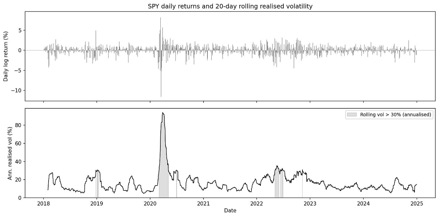 SPY daily log returns and 20-day rolling annualized realized volatility, 2018–2024. Long calm stretches near 10–15% punctuated by short clusters — late 2018, the COVID spike to ~94%, the 2022 sell-off, and the 2023 banking episodes. Roughly 5% of days exceed 30% annualised volatility. From the primer “Volatility: Realized, Implied, and Why It Clusters”.