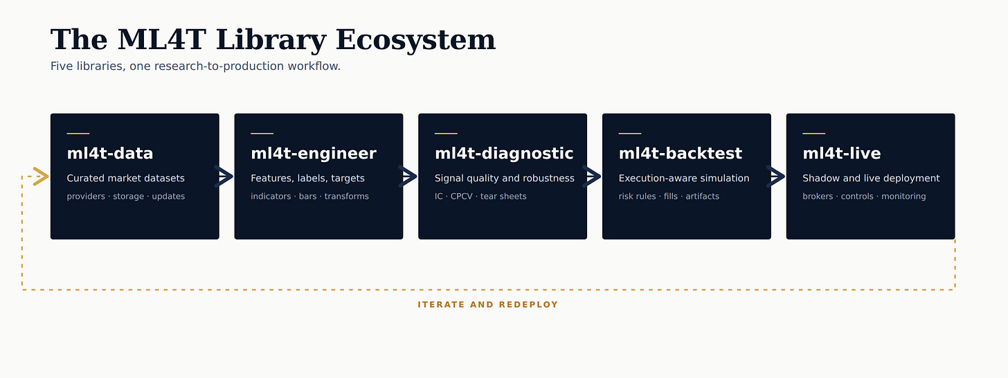 The five libraries trace the research-to-production path the book teaches: data acquisition, feature engineering, signal validation, strategy simulation and evaluation, and live deployment. Each library is finance-native — APIs, semantics, and data contracts tailored to the domain rather than borrowed from a generic ML stack. The chapters establish the methods. The library, its tests, and its validation harness ensure the methods are implemented correctly at scale.